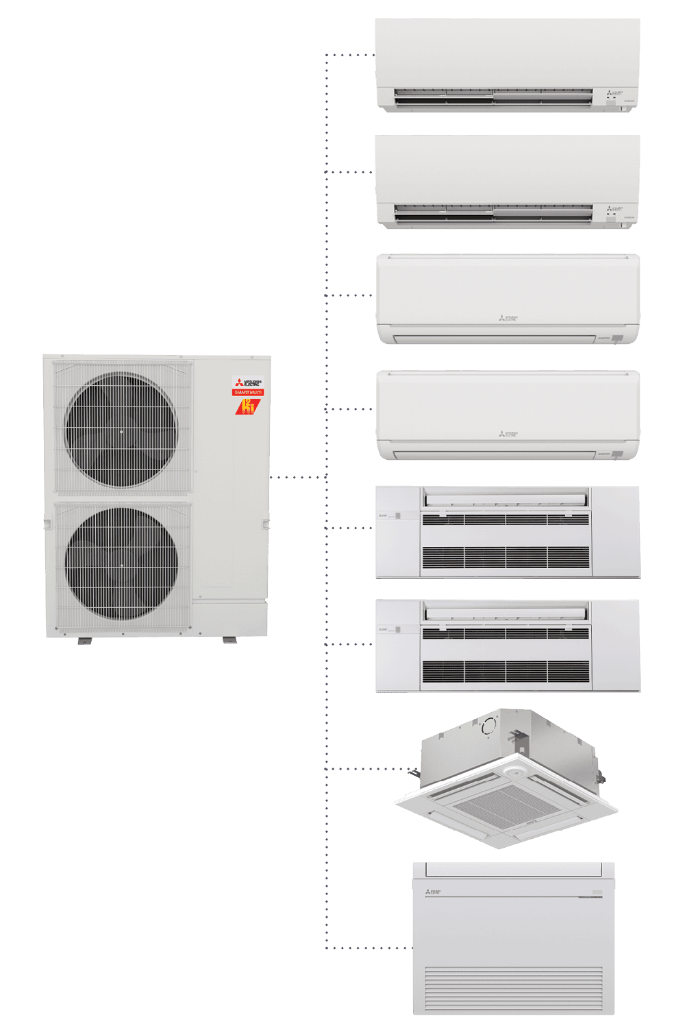 Mixed/hybrid systems combine different head types on one outdoor unit: ducted in the hallway, wall-mount in the master, cassette in the kitchen. Mitsubishi MXZ outdoor units support up to 8 mixed heads.